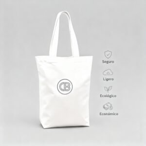 Cuida el planeta y promociona tu marca con esta bolsa ecológica de tela blanca tipo tote bag, diseñada para ser ligera, segura, reutilizable y económica. Gracias a su diseño práctico con asas resistentes, es perfecta para llevar compras, documentos, accesorios o materiales promocionales en ferias y eventos.