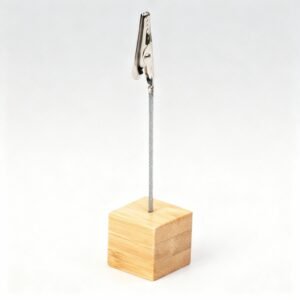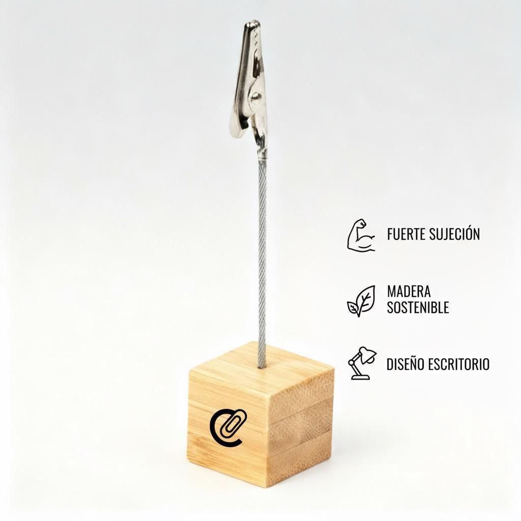 La base de madera natural ofrece una apariencia cálida y profesional, mientras que el clip metálico con cable flexible garantiza una sujeción firme y estable para tarjetas, fotografías o mensajes. Perfecto para personalizar con tu logotipo y promover una imagen de marca responsable con el medio ambiente.