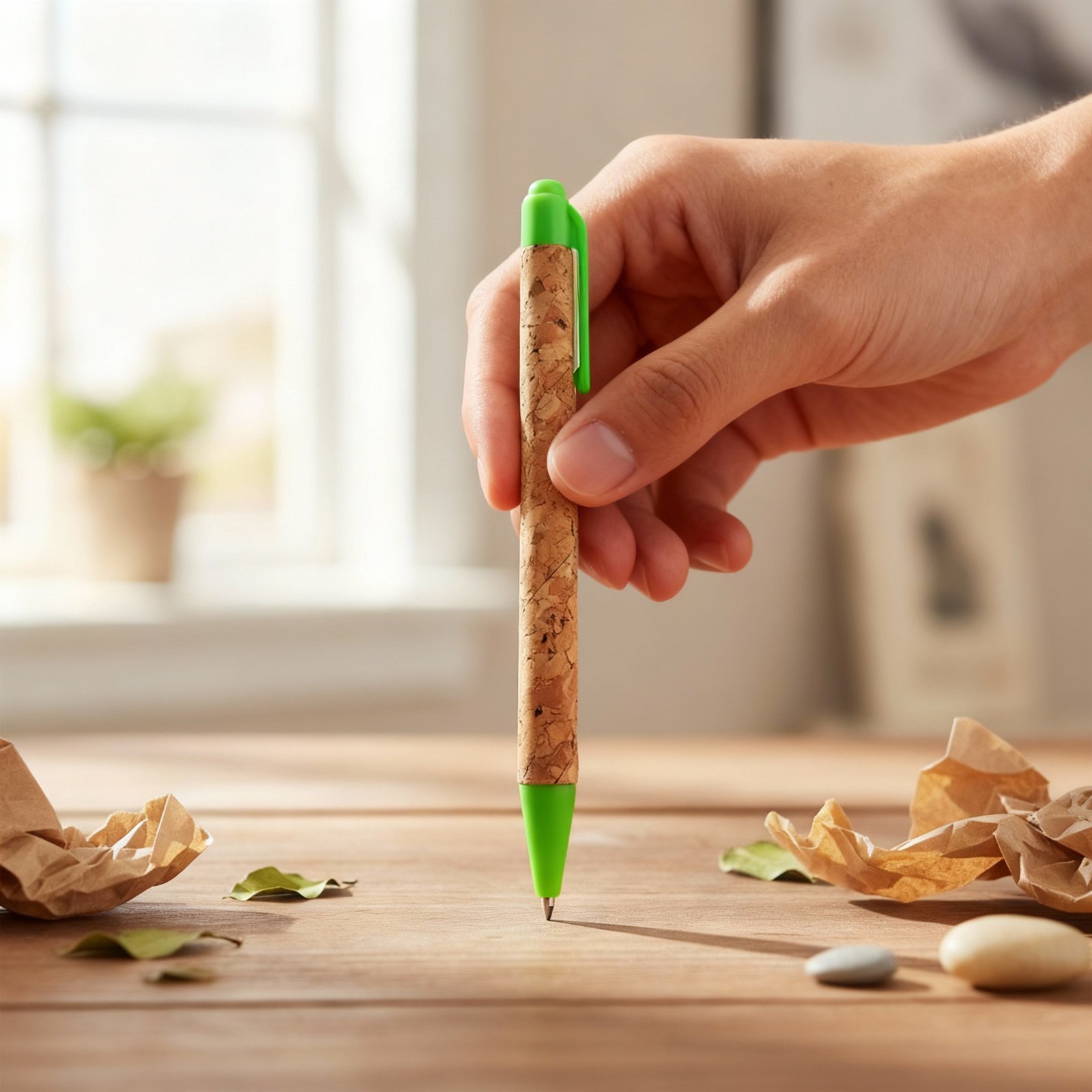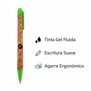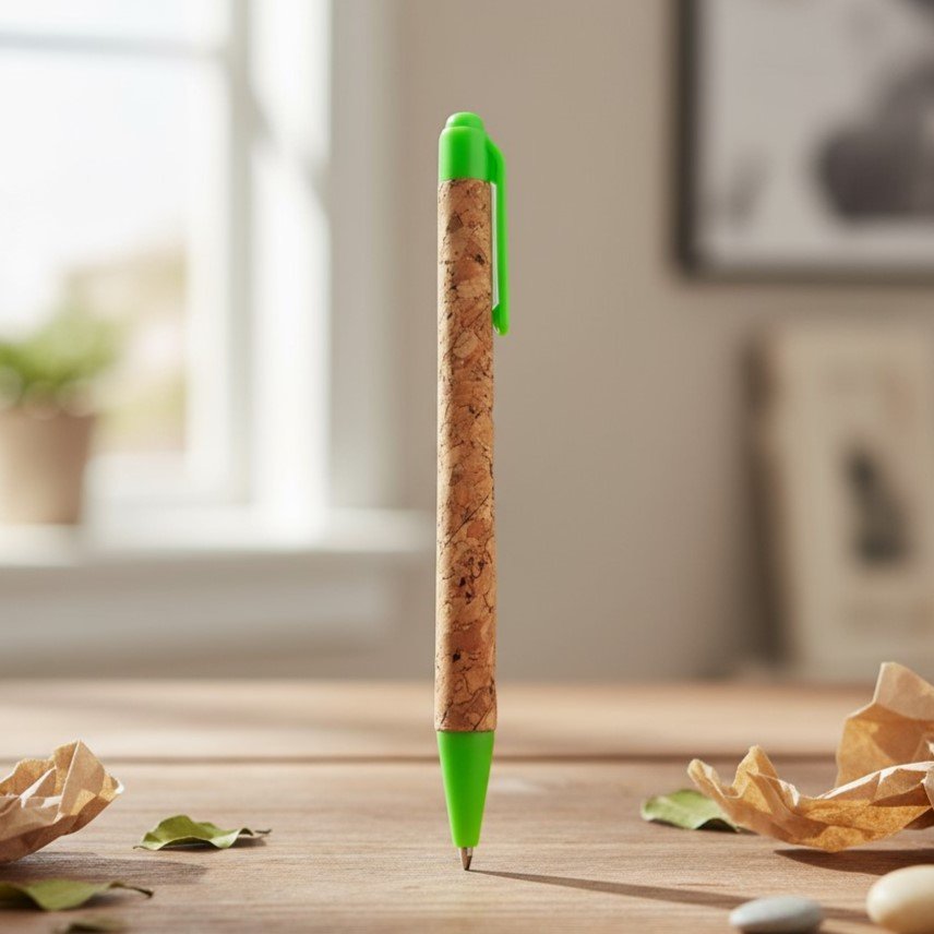 Con detalles verdes modernos y un cuerpo de corcho natural, este bolígrafo no solo es práctico, sino también un símbolo de innovación y responsabilidad ambiental.