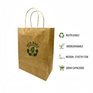 Aporta valor a tu marca con esta bolsa ecológica de papel Kraft con asas, una opción reutilizable, biodegradable y resistente para entregar productos de manera práctica y responsable con el medio ambiente. Con medidas de 21x27x11 cm, ofrece una gran capacidad para llevar artículos de diferentes tamaños, siendo ideal para tiendas, ferias, eventos corporativos o campañas publicitarias.