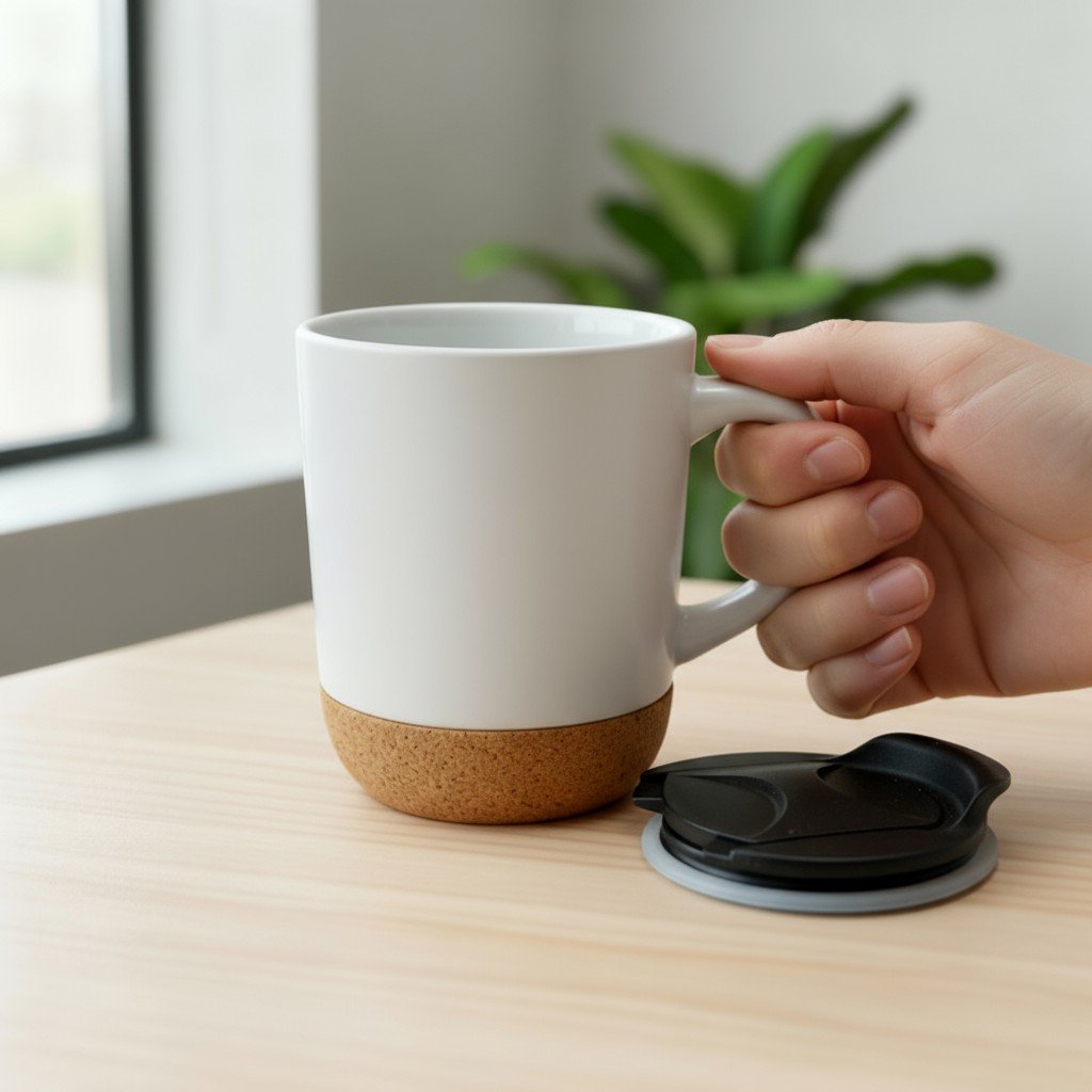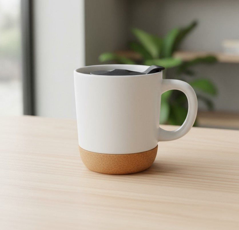 La base de corcho natural y sostenible no solo aporta un diseño moderno y elegante, sino que también ofrece mayor estabilidad y protección contra superficies calientes. Además, esta taza es reutilizable y ecológica, una alternativa ideal para reducir el consumo de plásticos desechables y cuidar el medio ambiente.